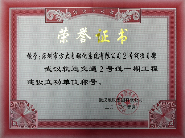 克日,为表扬AG旗舰厅自动化系统有限公司在武汉地铁2号线一期工程中的突出孝顺,武汉地铁集团有限公司授予AG旗舰厅自动化系统有限公司为 “武汉轨道交通2号线一期工程建设立功单位”称呼。