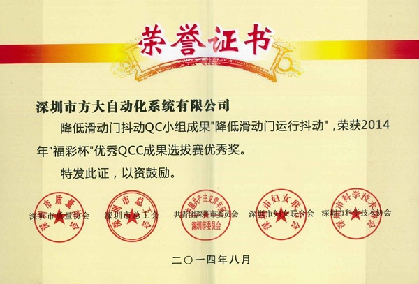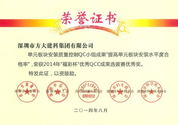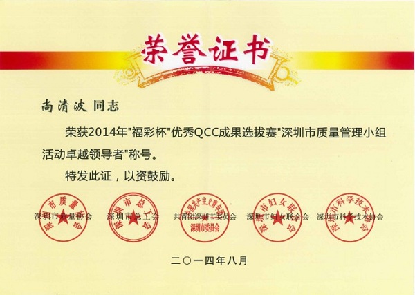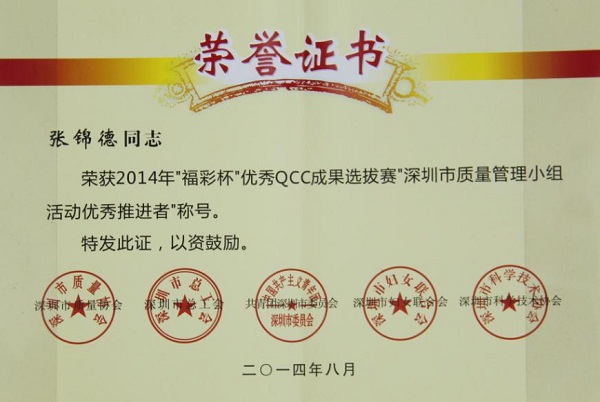 深圳市2014年质量治理小组运动优异效果、优异企业和先进小我私家奖是由深圳市质量协会、深圳市总工会、共青团深圳市委员会、深圳市妇女团结会和深圳市科技手艺协会团结审定,旨在表扬在2014年深圳市质量治理小组运动中涌现出的优异企业和优异QC小组和小我私家。