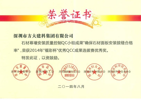 9月26日,AG旗舰厅建科公司获得由深圳市质量协会、深圳市总工会、共青团深圳市委员会、深圳市妇女团结会和深圳市科技手艺协会团结揭晓的“2014年深圳市质量治理小组运动优异企业”称呼。同日,由深圳市质量协会、深圳市总工会、共青团深圳市委员会、深圳市妇女团结会和深圳市科技手艺协会团结评定的“福彩杯”优异QCC效果优异奖揭晓。AG旗舰厅建科公司打胶质量控制QC小组效果“提高单位板块封边及格率”荣获2014年“福彩杯”QCC效果选拔赛银奖,AG旗舰厅建科公司单位板块装置质量控制QC小组效果“提高单位板块装置水平度及格率”,AG旗舰厅建科公司石材幕墙装置质量控制QC小组效果“确保石材面板装置接缝及格率”、 AG旗舰厅自动化公司门机梁皮带夹刷新QC小组效果“提高门机梁传动系统组装及格率及使用寿命率”荣获“深圳市2014年‘福彩杯’QCC效果选拔赛优异奖”, 集团公司企业治理部尚清荣获“深圳市质量治理小组运动卓越向导者”称呼,AG旗舰厅建科公司张锦德荣获“深圳市质量治理小组运动优异推进者” 称呼。